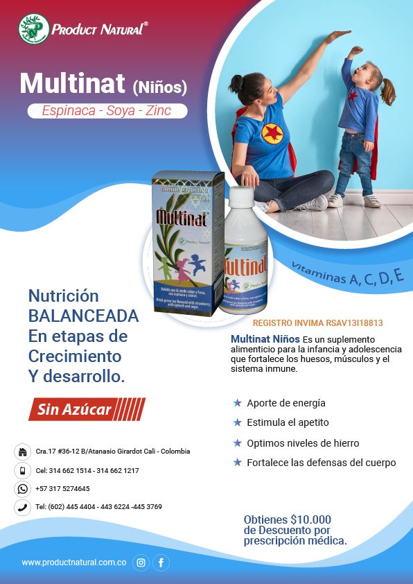 Multinat Niños Es un suplemento alimenticio natural con Espinacas, Aislado de soya + Vitaminas A-C-D-E, Hierro-Zinc,